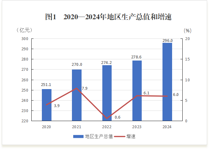 根據(jù)地區(qū)生產(chǎn)總值(GDP)統(tǒng)一核算初步結(jié)果反饋,2024年全縣地區(qū)生產(chǎn)總值296.0億元,按不變價格計算,比上年增長6.0%(簡稱增長,下同)。其中,第一產(chǎn)業(yè)增加值51.8億元,增長2.1%;第二產(chǎn)業(yè)增加值87.8億元,增長4.4%;第三產(chǎn)業(yè)增加值156.4億元,增長8.2%。三次產(chǎn)業(yè)對經(jīng)濟增長的貢獻率分別為6.9%、22.4%、70.8%,依次拉動經(jīng)濟增長0.4個百分點、1.3個百分點、4.2個百分點。三次產(chǎn)業(yè)結(jié)構由上年的18.4:30.2:51.5調(diào)整為17.5:29.7:52.8。人均地區(qū)生產(chǎn)總值42260元,增長6.3%。