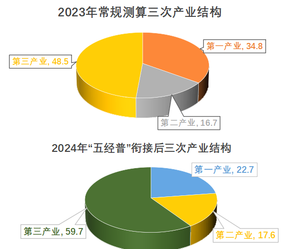 2024年全區(qū)實現(xiàn)地區(qū)生產(chǎn)總值[1]142.2億元(第五次全國經(jīng)濟普查銜接),比上年增長2.7%。其中,第一產(chǎn)業(yè)實現(xiàn)增加值32.2億元,比上年下降0.1%;第二產(chǎn)業(yè)實現(xiàn)增加值25.1億元,比上年增長5.2%;第三產(chǎn)業(yè)實現(xiàn)增加值84.9億元,比上年增長3.5%?!拔褰?jīng)普”銜接后產(chǎn)業(yè)結(jié)構(gòu)發(fā)生較大變化,三次產(chǎn)業(yè)結(jié)構(gòu)由上年的從34.8:16.7:48.5調(diào)整為22.7:17.6:59.7。