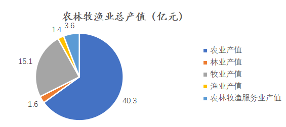農(nóng)林牧漁業(yè)。全年完成農(nóng)林牧漁業(yè)總產(chǎn)值62.0億元,比上年增長0.5%。其中農(nóng)業(yè)產(chǎn)值40.3億元,比上年下降0.9%;林業(yè)產(chǎn)值1.6億元,比上年增長0.2%;牧業(yè)產(chǎn)值15.1億元,比上年增長3%;漁業(yè)產(chǎn)值1.4億元,比上年增長6.1%;農(nóng)林牧漁服務業(yè)產(chǎn)值3.6億元,比上年增長4.6%。