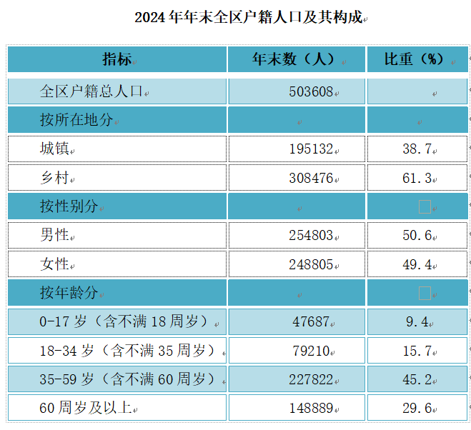 年末戶籍總?cè)丝?03608人。其中,城鎮(zhèn)人口195132人,戶籍人口城鎮(zhèn)化率38.7%。在全區(qū)人口中,60歲以上老年人口148889人,占總?cè)丝诘谋戎貫?9.6%。全區(qū)出生人口1483人,出生率2.9‰,死亡人口3052人,死亡率6.1‰。全區(qū)人口自然增長率為-3.1‰。