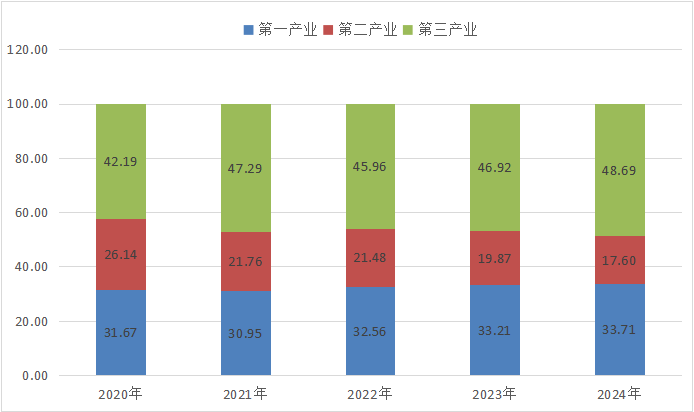 圖2:2020年--2024年三次產(chǎn)業(yè)增加值占地區(qū)生產(chǎn)總值比重