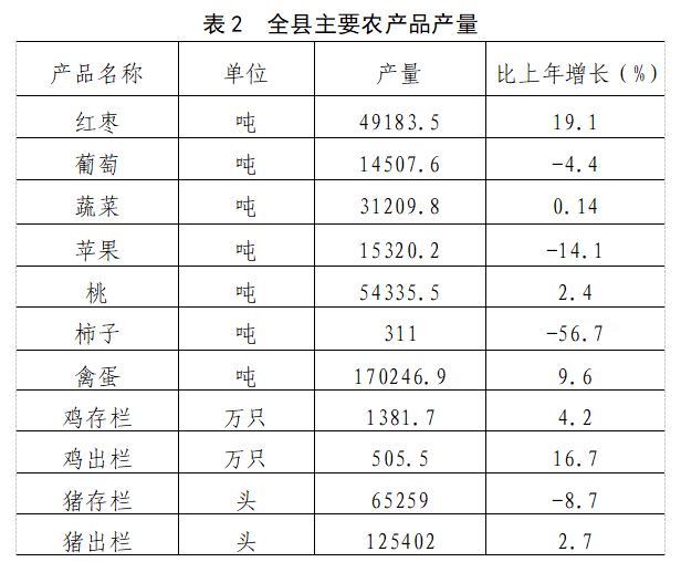 全年全縣農(nóng)作物播種面積766276.492畝,增長3.88%。全年糧食種植面積680595.592畝,下降0.17%。其中,夏糧種植面積361037.09畝,增長0.29%;秋糧種植面積319558.502畝,下降0.69%。全年油料種植面積1758.3畝,下降2.07%。全年果園種植面積74231.8畝,下降4.8%。其中,紅棗種植面積42508畝,下降3.19%;葡萄種植面積5385畝,下降4.1%;蘋果種植面積5525畝,下降18.3%;桃種植面積17910畝,下降3.5%。全年蔬菜種植面積9690.8畝,下降3.68%。