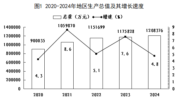 初步核算,全年全縣地區(qū)生產(chǎn)總值(GDP)1208376萬元,按不變價格計算,增長4.8%。其中,第一產(chǎn)業(yè)增加值218545萬元,增長5.2%;第二產(chǎn)業(yè)增加值372382萬元,增長6.0%,其中全部工業(yè)增加值350547萬元,增長6.5%,建筑業(yè)增加值21835萬元,增長0.8%;第三產(chǎn)業(yè)增加值617449萬元,增長3.9%。第三產(chǎn)業(yè)中,批發(fā)和零售業(yè)161413萬元,增長3.1%;交通運(yùn)輸、倉儲和郵政業(yè)74393萬元,下降0.8%;住宿和餐飲業(yè)14546萬元,下降2.7%;金融業(yè)47618萬元,增長10.4%;房地產(chǎn)業(yè)75212萬元,增長2.6%;營利性服務(wù)業(yè)32812萬元,增長34.7%;非營利性服務(wù)業(yè)200123萬元,下降0.4%。三次產(chǎn)業(yè)增加值的構(gòu)成為18.1:30.8:51.1,對經(jīng)濟(jì)增長的貢獻(xiàn)率分別為19.64%、36.43%、43.93%,依次拉動經(jīng)濟(jì)增長點數(shù)分別為0.93、1.73、2.09個百分點。全年人均地區(qū)生產(chǎn)總值達(dá)到39899元,增長6.0%。