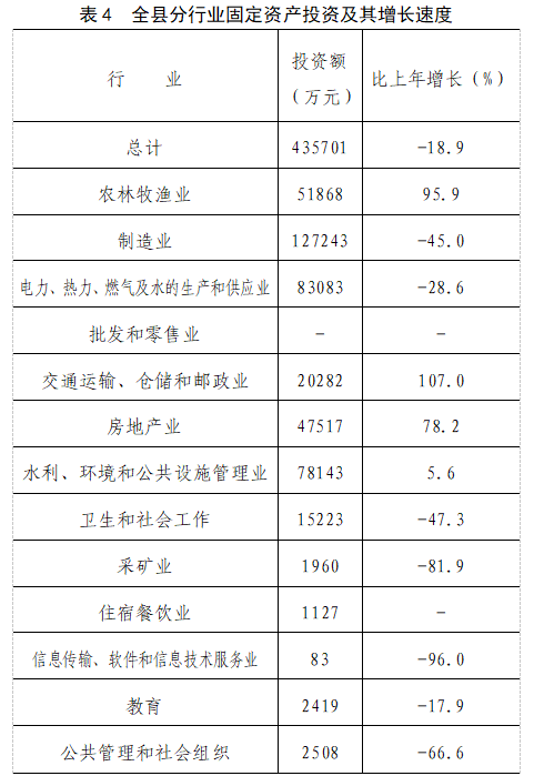 全年全縣共完成固定資產(chǎn)投資435701萬元,下降18.9%。其中,投資項目388184萬元,下降23.9%;房地產(chǎn)投資47517萬元,增長78.2%。