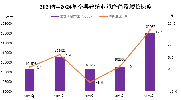 2024年,全縣具有資質(zhì)的總承包和專業(yè)承包建筑業(yè)企業(yè)14家,完成建筑業(yè)總產(chǎn)值120267萬元,比上年增長17.2%,建筑業(yè)企業(yè)房屋施工面積601535平方米,比上年下降14.6%,房屋竣工面積119402平方米。