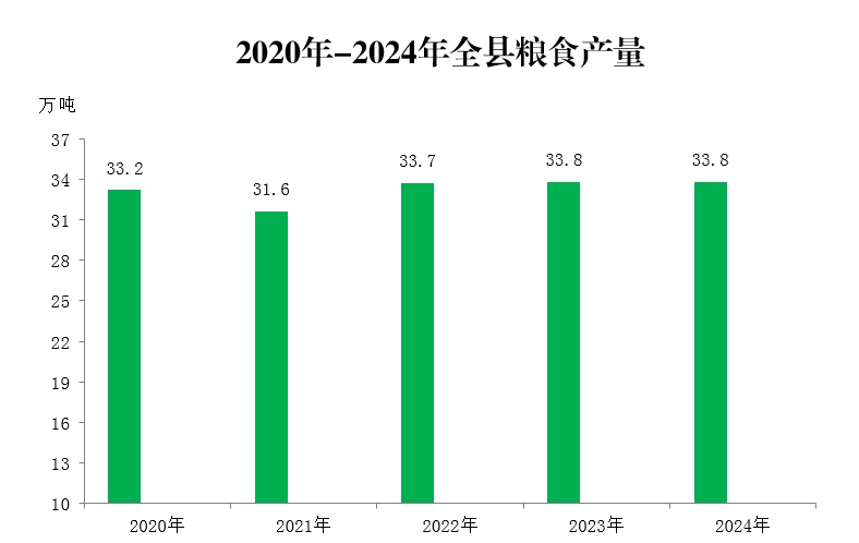 全年糧食總產(chǎn)量33.84萬噸,比上年增長0.2%。其中,小麥產(chǎn)量1.84萬噸,比上年下降27.2%;玉米產(chǎn)量29.41萬噸,比上年增長4.9%;馬鈴薯產(chǎn)量0.44萬噸,比上年下降27.9%。