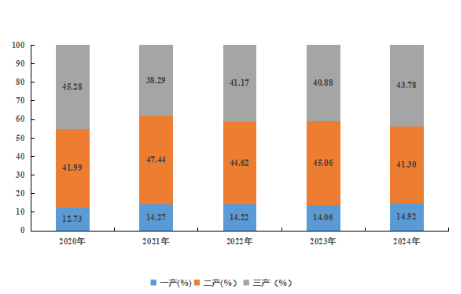 圖2? 2020—2024年合山市三次產(chǎn)業(yè)增加值占GDP比重大牛工程師