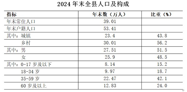 年末全縣戶籍人口53.41萬(wàn)人,比上年末減少2100余人;全年人口出生率4.49‰,死亡率4.32‰,自然增長(zhǎng)率0.18‰。