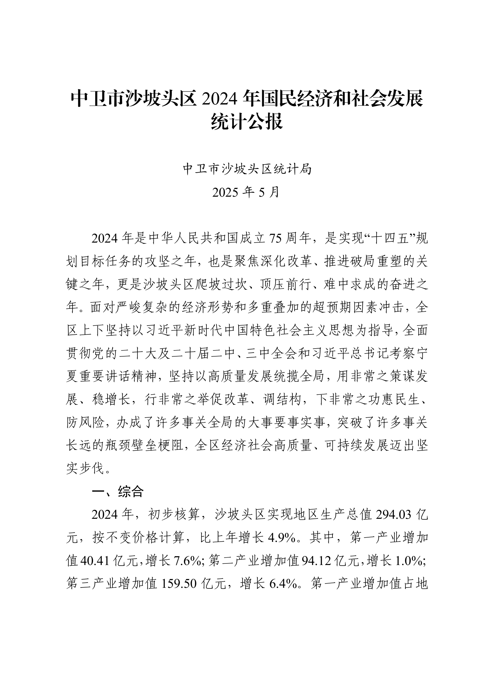 2024年中衛(wèi)市沙坡頭區(qū)人民政府國(guó)民經(jīng)濟(jì)和社會(huì)發(fā)展統(tǒng)計(jì)公報(bào)(2025年更新)