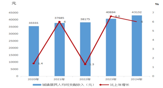 2024年,城鎮(zhèn)居民人均可支配收入43132元,較同期增加2438元,同比增長6.0%;農(nóng)村居民人均可支配收入29865元,較同期增加2516元,同比增長9.2%。