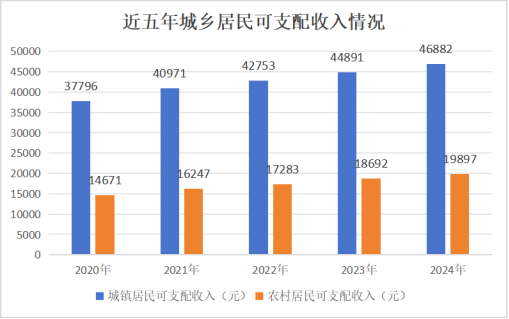 全年居民可支配收入33926元,較上年增長4.4%;城鎮(zhèn)常住居民人均可支配收入46882元,增長4.4%;農(nóng)村常住居民人均可支配收入19897元,增長6.5%。