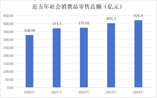 全年社會(huì)消費(fèi)品零售總額為421.4億元,比上年增長4.5%。其中,限額以上消費(fèi)品零售額增長0.9%。分城鄉(xiāng)看,城鎮(zhèn)增長0.8%;鄉(xiāng)村增長2.7%。限額以上單位通過公共網(wǎng)絡(luò)實(shí)現(xiàn)的商品銷售額下降17.8%。全區(qū)批發(fā)業(yè)銷售額410.9億元,比上年增長5.6%;零售業(yè)銷售額524.7億元,增長7.2%;住宿業(yè)營業(yè)額增長9%;餐飲業(yè)營業(yè)額增長7.1%。