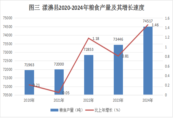 2024年,農(nóng)林牧漁業(yè)總產(chǎn)值271080萬(wàn)元,同比增長(zhǎng)2.5%,其中:農(nóng)業(yè)產(chǎn)值182511萬(wàn)元,同比增長(zhǎng)1.6%;林業(yè)產(chǎn)值12654萬(wàn)元,同比增長(zhǎng)31%;畜牧業(yè)產(chǎn)值64595萬(wàn)元,減少0.1%;漁業(yè)產(chǎn)值393萬(wàn)元,增長(zhǎng)4.2%;農(nóng)林牧漁服務(wù)業(yè)產(chǎn)值?10927萬(wàn)元,同比增長(zhǎng)8.4%。農(nóng)作物總播種面積345407畝,其中糧食播種面積227310畝。糧食總產(chǎn)量74517噸,同比增長(zhǎng)1.46%。