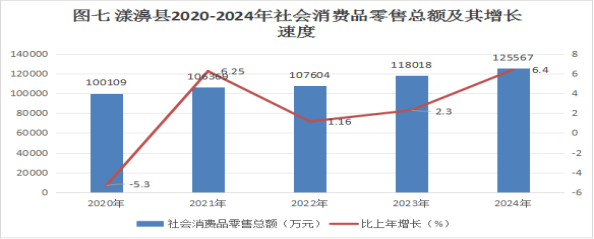2024年,全縣社會(huì)消費(fèi)品零售總額125567萬(wàn)元,同比增長(zhǎng)6.4%。