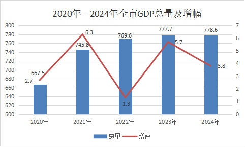 初步核算,全市地區(qū)生產(chǎn)總值(GDP)778.6億元,按可比價格計算,比上年增長3.8%。其中,第一產(chǎn)業(yè)增加值159.8億元,比上年增長3.8%;第二產(chǎn)業(yè)增加值201.8億元,與上年持平;第三產(chǎn)業(yè)增加值417.1億元,比上年增長5.5%。三次產(chǎn)業(yè)增加值占地區(qū)生產(chǎn)總值(GDP)的比重分別為20.5%、25.9%和53.6%。全年全市人均GDP實現(xiàn)34674元,比上年增長4.7%。