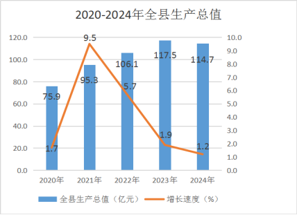 初步核算,全年全縣地區(qū)生產(chǎn)總值1147474萬元,按不變價格計算,比上年增長1.2%。其中,第一產(chǎn)業(yè)增加值199164萬元,增長5.5%,占生產(chǎn)總值的比重為17.4%;第二產(chǎn)業(yè)增加值332745萬元,下降5.3%,占生產(chǎn)總值的比重為29%;第三產(chǎn)業(yè)增加值615565萬元,增長2.9%,占生產(chǎn)總值的比重為53.6%。人均地區(qū)生產(chǎn)總值44832元,按2024年平均匯率計算為6295美元。