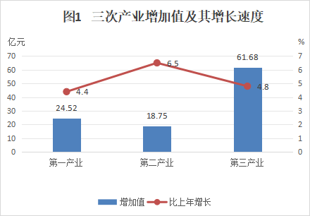 服務(wù)業(yè)。全年全縣批發(fā)和零售業(yè)增加值7.69億元,比上年增長5.6%;交通運(yùn)輸、倉儲和郵政業(yè)增加值3.22億元,比上年增長8.1%;住宿和餐飲業(yè)增加值5.27億元,比上年增長7.8%;金融業(yè)增加值5.76億元,比上年增長1.2%;房地產(chǎn)業(yè)增加值6.24億元,比上年增長3.7%;其他服務(wù)業(yè)增加值32.69億元,比上年增長4.8%;農(nóng)、林、牧、漁服務(wù)業(yè)增加值0.80萬元,比上年增長2.9%。