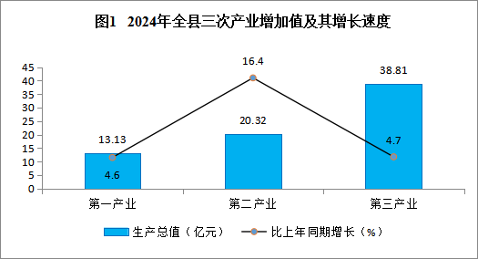 根據(jù)縣(市)生產(chǎn)總值統(tǒng)一核算結(jié)果,全年全縣地區(qū)生產(chǎn)總值72.26億元,比上年增長7.8%。其中,第一產(chǎn)業(yè)增加值13.13億元,比上年增長4.6%,占地區(qū)生產(chǎn)總值的比重為18.2%;第二產(chǎn)業(yè)增加值20.32億元,比上年增長16.4%,占地區(qū)生產(chǎn)總值的比重為28.1%;第三產(chǎn)業(yè)增加值38.81億元,比上年增長4.7%,占地區(qū)生產(chǎn)總值的比重為53.7%。全年全縣人均地區(qū)生產(chǎn)總值42937元,比上年增長6.9%。