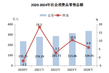 全年社會(huì)消費(fèi)品零售總額334.95億元,比上年增長(zhǎng)6.0%。按經(jīng)營(yíng)地分,城鎮(zhèn)消費(fèi)品零售額301.63億元,增長(zhǎng)5.8%;鄉(xiāng)村消費(fèi)品零售額33.33億元,增長(zhǎng)8.3%。按消費(fèi)形態(tài)分,商品零售276.12億元,增長(zhǎng)3.2%;餐飲收入58.83億元,增長(zhǎng)22.1%。