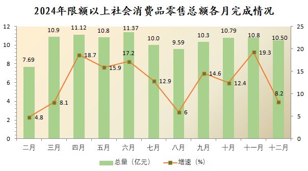 2024年,全區(qū)社會消費品零售總額實現(xiàn)406.57億元,增長7.6%,其中限額以上社會消費品零售總額實現(xiàn)126.5億元,增長11.6%。