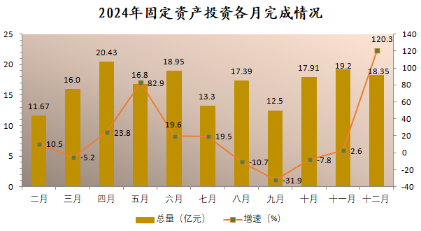2024年,固定資產(chǎn)投資完成184.4億元,同比增長4.6%,其中:項目投資完成133.82億元,增長28.7%;房地產(chǎn)投資完成50.58億元,下降30%。房地產(chǎn)銷售面積完成24.06萬平方米,實現(xiàn)銷售額21.11億元。