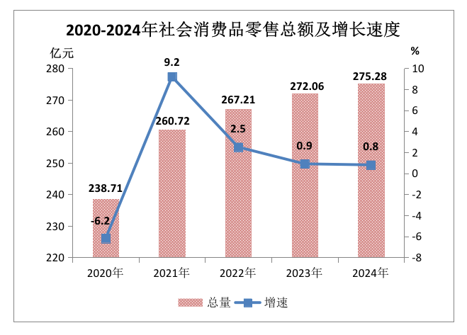 全年社會(huì)消費(fèi)品零售總額275.28億元,比上年增長(zhǎng)0.8%。其中,限上批發(fā)和零售業(yè)零售額137.92億元,下降0.4%;限上住宿和餐飲業(yè)零售額15.55億元,增長(zhǎng)1.6%。