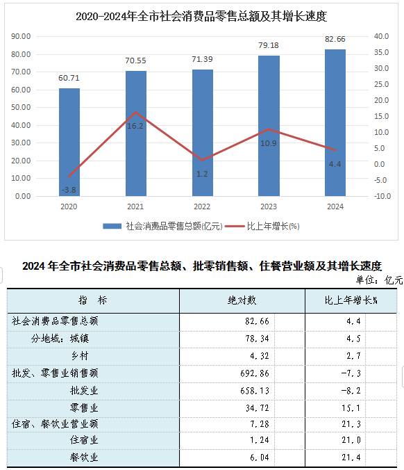 按經(jīng)營地統(tǒng)計(jì),城鎮(zhèn)消費(fèi)品零售額78.34億元,比上年增長4.5%;鄉(xiāng)村消費(fèi)品零售額4.32億元,增長2.7%。按消費(fèi)形態(tài)統(tǒng)計(jì),商品零售額79.35億元,增長4.4?%;餐飲收入額3.31億元,增長4.4%。