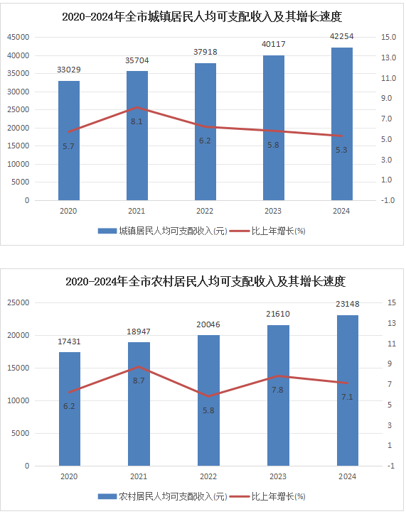 全年全市居民人均可支配收入35010元,比上年增長5.9%。其中,城鎮(zhèn)居民人均可支配收入42254元,增長5.3%,農(nóng)村居民人均可支配收入23148元,增長7.1%。