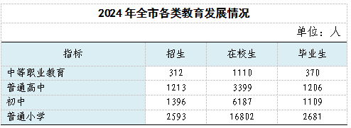 年末,全市有中等職業(yè)中專1所,普通中學(xué)11所,小學(xué)29所,特殊教育學(xué)校1所,注冊幼兒園64所。小學(xué)學(xué)齡兒童入學(xué)率100%,小學(xué)六年鞏固率100%,初中三年保留率100%,高中階段毛入學(xué)率達(dá)到95%。