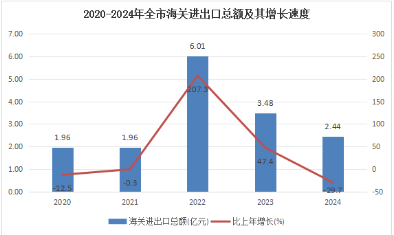 全年全市(新口徑)海關(guān)進(jìn)出口總額2.44億元,比上年下降29.7%。其中,進(jìn)口額1.62億元,增長20.4%;出口額0.82億元,下降61.5%。