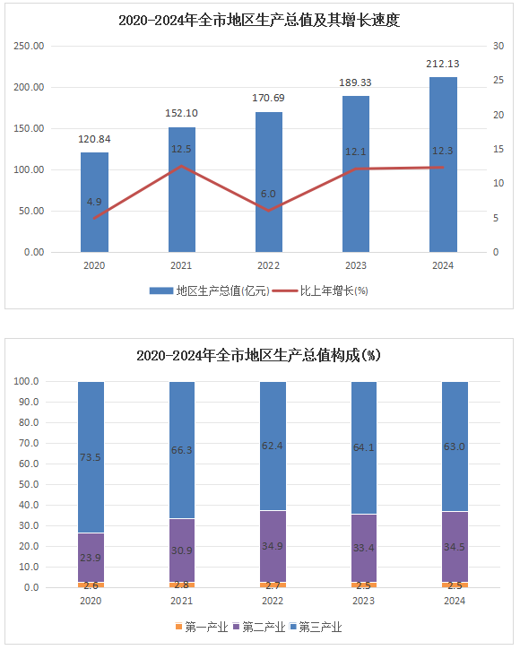 初步核算,全年全市地區(qū)生產(chǎn)總值212.13億元,按不變價(jià)格計(jì)算,比上年增長12.3%。其中,第一產(chǎn)業(yè)增加值5.25億元,增長6.3%,占生產(chǎn)總值的比重為2.5%;第二產(chǎn)業(yè)增加值73.10億元,增長24.8%,占生產(chǎn)總值的比重為34.5%;第三產(chǎn)業(yè)增加值133.78億元,增長6.9%,占生產(chǎn)總值的比重為63.0%。