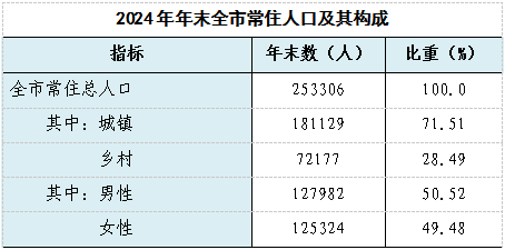 據(jù)2024年人口抽樣調(diào)查,年末全市常住人口253306人,比上年末減少2886人。全年全市出生人口1987人,出生率為7.80‰,死亡人口2007人,死亡率為7.88‰,自然增長率為-0.08‰。
