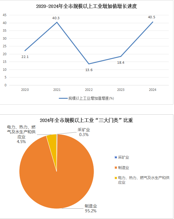 年末全市規(guī)模以上工業(yè)企業(yè)68家。全年全市規(guī)模以上工業(yè)增加值比上年增長40.5%。其中,采礦業(yè)下降41.6%,增加值占規(guī)模以上工業(yè)增加值的0.3%;制造業(yè)增長42.3%,增加值占規(guī)模以上工業(yè)增加值的95.2%;電力、熱力、燃?xì)饧八a(chǎn)和供應(yīng)業(yè)增長24.3%,增加值占規(guī)模以上工業(yè)增加值的4.5%。