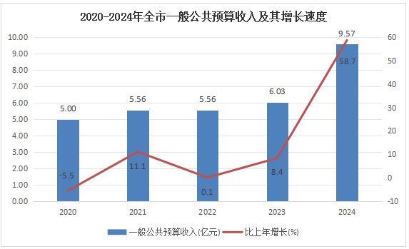 全年全市一般公共預(yù)算收入9.57億元,比上年增長58.7%。其中,稅收收入4.46億元,下降7.2%,占一般公共預(yù)算收入的比重為46.6%;非稅收入5.10億元,增長318.8%,占一般公共預(yù)算收入的比重為53.4%。