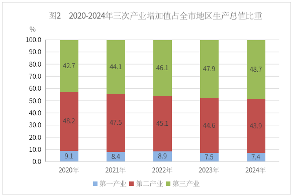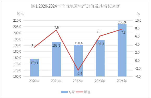 2024年,全市實(shí)現(xiàn)地區(qū)生產(chǎn)總值(GDP)206.9億元,同比增長(zhǎng)(以下簡(jiǎn)稱增長(zhǎng))7.8%。其中:第一產(chǎn)業(yè)實(shí)現(xiàn)增加值15.3億元,增長(zhǎng)1.9%;第二產(chǎn)業(yè)實(shí)現(xiàn)增加值90.9億元,增長(zhǎng)7.8%;第三產(chǎn)業(yè)實(shí)現(xiàn)增加值100.7億元,增長(zhǎng)8.9%。三次產(chǎn)業(yè)結(jié)構(gòu)為7.4:43.9:48.7。