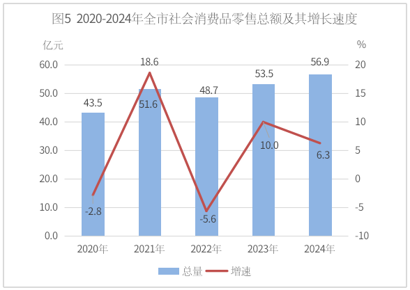 全年實(shí)現(xiàn)社會(huì)消費(fèi)品零售總額56.9億元,增長(zhǎng)6.3%。按經(jīng)營(yíng)單位所在地分,城鎮(zhèn)實(shí)現(xiàn)消費(fèi)品零售額38.2億元,增長(zhǎng)5.8%;鄉(xiāng)村實(shí)現(xiàn)消費(fèi)品零售額18.7億元,增長(zhǎng)7.5%。按消費(fèi)類型分,商品零售額48.1億元,增長(zhǎng)6.2%;餐飲收入8.8億元,增長(zhǎng)7.3%。