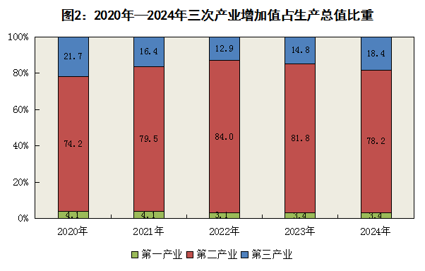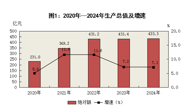 初步核算,全年全縣生產(chǎn)總值433.3億元,按可比價格計算,比上年增長7.1%。其中,第一產(chǎn)業(yè)增加值14.8億元,增長4.1%;第二產(chǎn)業(yè)增加值338.7億元,增長8.5%;第三產(chǎn)業(yè)增加值79.8億元,增長3.1%。三次產(chǎn)業(yè)占GDP比重為3.4:78.2﹕18.4,三次產(chǎn)業(yè)對經(jīng)濟增長的貢獻率分別為2.5%、88.2%和9.3%,分別拉動經(jīng)濟增長0.2、6.3和0.7個百分點。第三產(chǎn)業(yè)中,金融業(yè)增加值5.1億元,增長15.2%,對經(jīng)濟增長的貢獻率為2.8%,拉動經(jīng)濟增長0.2個百分點;交通運輸、倉儲郵政業(yè)增加值9.3億元,下降3.0%,對經(jīng)濟增長的貢獻率為-1.2%,下拉經(jīng)濟0.1個百分點;批發(fā)和零售業(yè)增加值14.2億元,增長8.0%,對經(jīng)濟增長的貢獻率為3.7%,拉動經(jīng)濟增長0.3個百分點;營利性服務業(yè)增加值8.3億元,下降10.0%,對經(jīng)濟增長的貢獻率為-4.4%,下拉經(jīng)濟0.3個百分點;非營利性服務業(yè)增加值34.3億元,增長6.5%,對經(jīng)濟增長的貢獻率為7.7%,拉動經(jīng)濟增長0.6個百分點。按常住人口計算,人均地區(qū)生產(chǎn)總值228594元,按2024年平均匯率計算為32098美元。