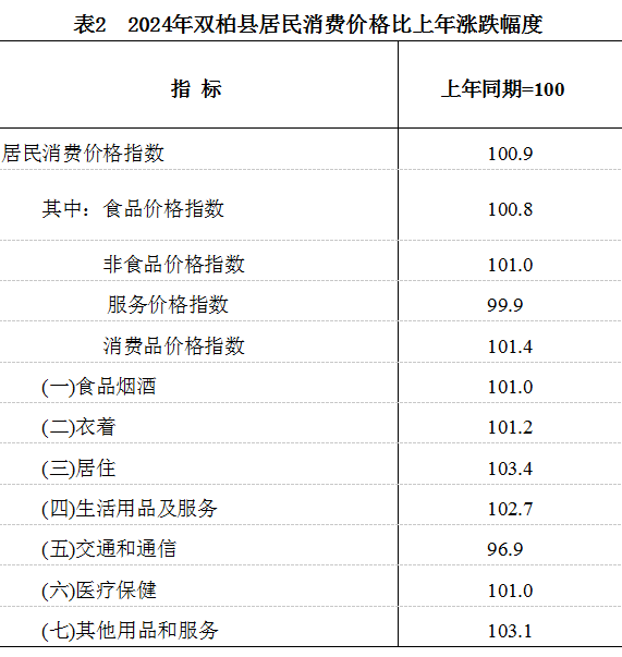 2024年全縣居民消費價格總水平比上年上漲0.9%。居民消費價格中,食品價格上漲0.6%(其中糧食價格下降2.1%),非食品價格上漲1.0%;消費品價格上漲1.4%,服務價格下降0.1%。