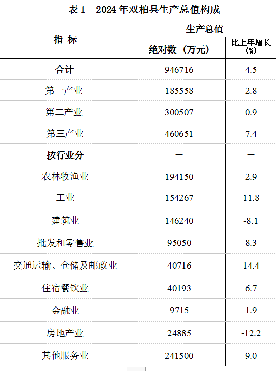 初步核算,2024年雙柏縣地區(qū)生產總值946716萬元,按可比價計算(下同),比上年增長4.5%。其中:第一產業(yè)增加值185558萬元,增長2.8%,對生產總值增長的貢獻率為12.4%,拉動經濟增長0.56個百分點;第二產業(yè)增加值300507萬元,增長0.9%,對生產總值增長的貢獻率為6.1%,拉動經濟增長0.27個百分點;第三產業(yè)增加值460651萬元,增長7.4%,對生產總值增長貢獻率為81.5%,拉動經濟增長3.67個百分點。