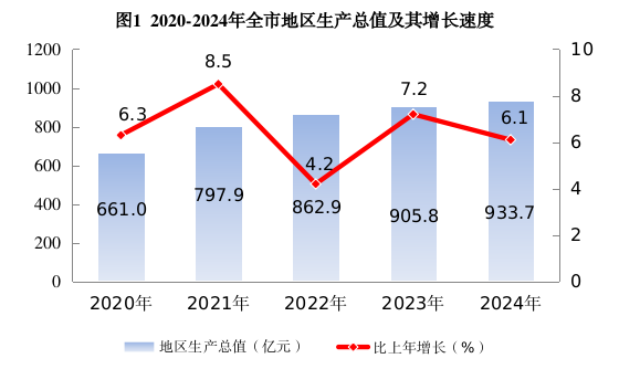 初步核算,全年全市實(shí)現(xiàn)地區(qū)生產(chǎn)總值933.72億元,按不變價(jià)格計(jì)算,比上年增長(zhǎng)6.1%。分產(chǎn)業(yè)看,第一產(chǎn)業(yè)實(shí)現(xiàn)增加值130.90億元,增長(zhǎng)5.6%;第二產(chǎn)業(yè)實(shí)現(xiàn)增加值399.94億元,增長(zhǎng)9.0%;第三產(chǎn)業(yè)實(shí)現(xiàn)增加值402.88億元,增長(zhǎng)3.6%。三次產(chǎn)業(yè)對(duì)經(jīng)濟(jì)增長(zhǎng)的貢獻(xiàn)率分別為11.8%、61.4%、26.8%。三次產(chǎn)業(yè)結(jié)構(gòu)為14.0:42.8:43.2。按常住人口計(jì)算,全市人均地區(qū)生產(chǎn)總值66268元,比上年增長(zhǎng)5.5%。