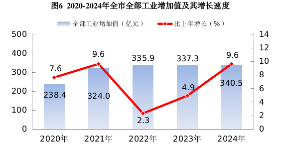 全年全市全部工業(yè)增加值340.52億元,比上年增長(zhǎng)9.6%,其中規(guī)模以上工業(yè)增加值比上年增長(zhǎng)12.4%。在規(guī)模以上工業(yè)中,分經(jīng)濟(jì)類型看,規(guī)模以上國(guó)有控股企業(yè)增長(zhǎng)2.6%,股份制企業(yè)增長(zhǎng)12.9%,外商及港澳臺(tái)商投資企業(yè)增長(zhǎng)12.4%;私營(yíng)企業(yè)增長(zhǎng)17.0%。分門類看,規(guī)模以上工業(yè)采礦業(yè)增長(zhǎng)8.0%,制造業(yè)增長(zhǎng)18.0%,電力、熱力、燃?xì)饧八纳a(chǎn)和供應(yīng)業(yè)增長(zhǎng)2.3%。采礦業(yè)、制造業(yè)、電力熱力燃?xì)饧八纳a(chǎn)和供應(yīng)業(yè)比重為24.5:58.2:17.3。分輕重工業(yè)看,規(guī)模以上輕工業(yè)增加值下降3.1%,重工業(yè)增長(zhǎng)14.8%。