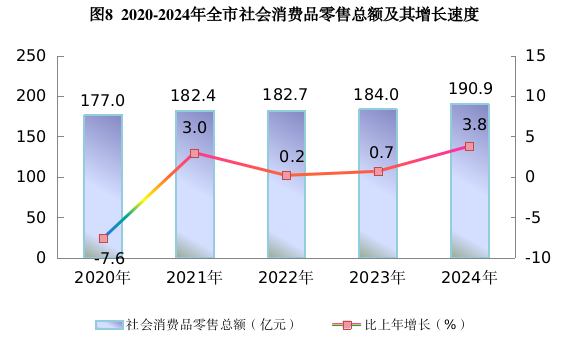 全年全市實(shí)現(xiàn)社會(huì)消費(fèi)品零售總額190.9億元,比上年增長(zhǎng)3.8%。按經(jīng)營(yíng)地分,城鎮(zhèn)消費(fèi)品零售額156.5億元,增長(zhǎng)3.3%;鄉(xiāng)村消費(fèi)品零售額34.4億元,增長(zhǎng)5.7%。按消費(fèi)類型分,商品零售額159.1億元,增長(zhǎng)3.4%;餐飲收入額31.8億元,增長(zhǎng)5.4%。