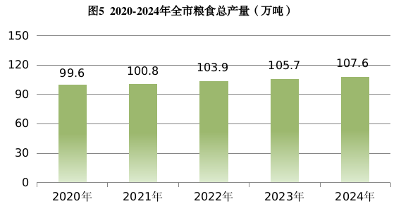 嚴(yán)格落實(shí)糧食安全責(zé)任制,糧食生產(chǎn)實(shí)現(xiàn)“二十一連豐”。全年糧食總產(chǎn)量107.58萬(wàn)噸,比上年增加1.84萬(wàn)噸,增產(chǎn)1.7%。其中,夏糧產(chǎn)量4.71萬(wàn)噸,減產(chǎn)13.6%;秋糧產(chǎn)量102.87萬(wàn)噸,增產(chǎn)2.6%。全市小麥產(chǎn)量4.63萬(wàn)噸,減產(chǎn)15.0%;水稻產(chǎn)量3.12萬(wàn)噸,增產(chǎn)6.8%;玉米產(chǎn)量95.73萬(wàn)噸,增產(chǎn)3.6%。