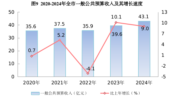 全年全市完成地方財(cái)政收入66.29億元,比上年增長(zhǎng)19.4%。其中一般公共預(yù)算收入43.14億元,增長(zhǎng)9.0%,其中稅收收入30.92億元,增長(zhǎng)5.6%。全年完成地方財(cái)政支出304.87億元,比上年增長(zhǎng)0.7%。其中一般公共預(yù)算支出278.09億元,增長(zhǎng)2.0%。