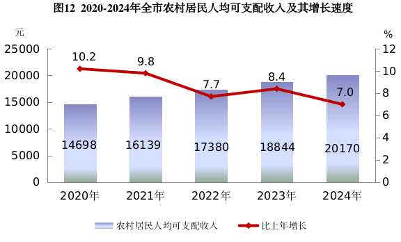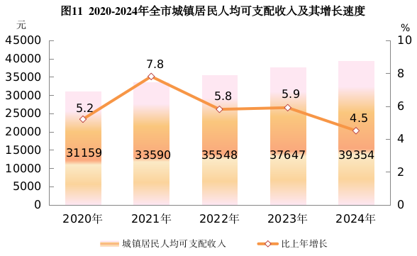 按常住地分,城鎮(zhèn)居民人均可支配收入39354元,比上年增長(zhǎng)4.5%。農(nóng)村居民人均可支配收入20170元,比上年增長(zhǎng)7.0%。城鄉(xiāng)居民人均可支配收入比(以農(nóng)村居民人均收入為1)為1.95,比上年縮小0.05。