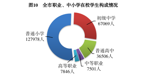 全市高等職業(yè)教育學(xué)校1所,招生2940人,在校生7846人,畢業(yè)生2574人;中等職業(yè)學(xué)校5所,招生2457人,在校生7501人,畢業(yè)生3046人;普通高中14所,招生13284人,在校生36506人,畢業(yè)生11650人;初級(jí)中學(xué)52所(其中普通初中39所,九年一貫制學(xué)校13所),招生22373人,在校生67069人,畢業(yè)生21750人;普通小學(xué)237所,招生19549人,在校生127978人,畢業(yè)生22186人;特殊教育4所,招生58人,在校生451人,畢業(yè)生152人;幼兒園283所,招生17165人,在園幼兒39351人,畢業(yè)生20779人。