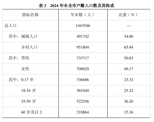 據(jù)公安年報(bào),年末全市戶籍總?cè)丝??144.35萬(wàn)人,其中,城鎮(zhèn)人口49.17萬(wàn)人,戶籍人口城鎮(zhèn)化率34.06%。