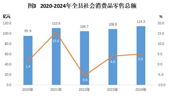 從銷(xiāo)售單位所在地看,城鎮(zhèn)社會(huì)消費(fèi)品零售總額69.8億元,比上年增長(zhǎng)5.3%;鄉(xiāng)村社會(huì)消費(fèi)品零售總額44.5億元,比上年增長(zhǎng)5.3?%。從消費(fèi)形態(tài)看,餐飲收入8.5億元,比上年增長(zhǎng)?5.4?%;商品零售105.8?億元,比上年增長(zhǎng)5.0%。