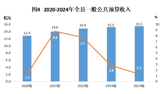 全年全縣一般公共預(yù)算收入15.5億元,比上年增長(zhǎng)1.3%。其中,稅收收入7.6億元,比上年下降7.9%,其中增值稅收入4.2億元,增長(zhǎng)2.7%,企業(yè)所得稅0.7億元,增長(zhǎng)30.5%,城市維護(hù)建設(shè)稅0.3億元,比上年下降8.8%。全年非稅收入8.0億元,比上年增長(zhǎng)11.8%,其中行政事業(yè)性收費(fèi)收入0.2億元,比上年下降54.3%,國(guó)有資源(資產(chǎn))有償使用收入6.0億元,比上年增長(zhǎng)26.4%。稅收收入占地方財(cái)政收入的比重為48.6%。