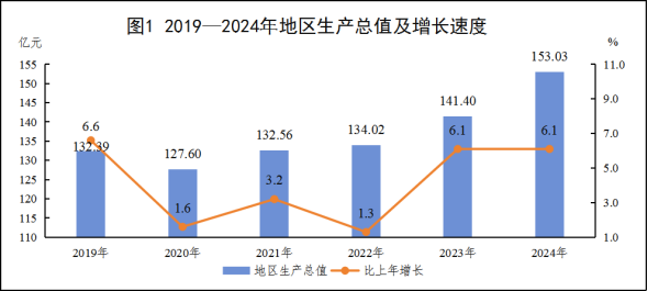 根據(jù)縣(區(qū))地區(qū)生產(chǎn)總值(GDP)統(tǒng)一核算初步結(jié)果,全年地區(qū)生產(chǎn)總值153.03億元,按可比價(jià)格計(jì)算,比上年增長(zhǎng)6.1%。其中,第一產(chǎn)業(yè)增加值41.38億元,增長(zhǎng)1.9%;第二產(chǎn)業(yè)增加值28.74億元,增長(zhǎng)5.9%;第三產(chǎn)業(yè)增加值82.91億元,增長(zhǎng)8.4%。全年人均地區(qū)生產(chǎn)總值30874元,增長(zhǎng)8.0%。